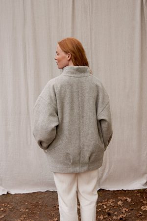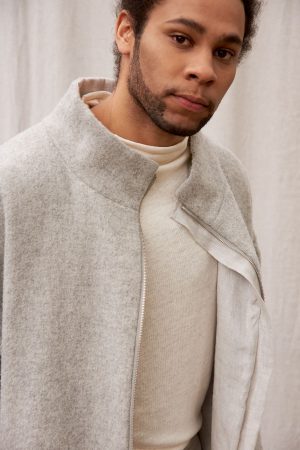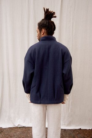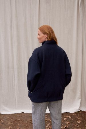 Leinenfutter ist etwas ganz Besonderes. Noé hat einen gemütlichen hochabschließenden Kragen, einen Reißverschluss in der vorderen Mitte, seitlich unser grafisches Taschendetail, überschnittene Schultern, einen weiten Fledermausärmel mit etwas kürzerem Arm und eine gelegte Falte am Saum, dadurch schmal zulaufend. Noé hat im Rückteil am Saum zwei gelegte Falten durch die der Blousoncharacter entsteht. Der Blouson ist hinten etwas kürzer als vorne. Auch auf Funktionalität wurde Wert gelegt und er überzeugt mit seiner Innentasche, auf Wunsch auch mit Reißverschluß.