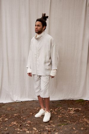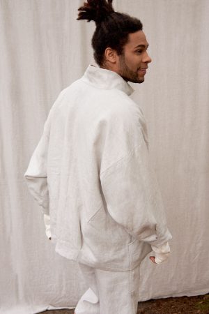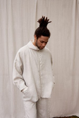 Unser vielseitiger Unisex Longblouson aus Bioleinen mit cremefarbenem ungefärbtem Leinenfutter ist etwas ganz Besonderes. Noé hat einen gemütlichen hochabschließenden Kragen, einen Reißverschluss in der vorderen Mitte, seitlich unser grafisches Taschendetail, dazu überschnittene Schultern, einen weiten Fledermausärmel mit etwas kürzerem Arm und eine gelegte Falte am Saum, dadurch schmal zulaufend. Noé hat im Rückteil am Saum zwei gelegte Falten durch die der Blousoncharakter entsteht. Der Blouson ist hinten etwas kürzer als vorne. Auch auf Funktionalität wurde Wert gelegt und er überzeugt mit seiner Innentasche, auf Wunsch auch mit Reißverschluß.