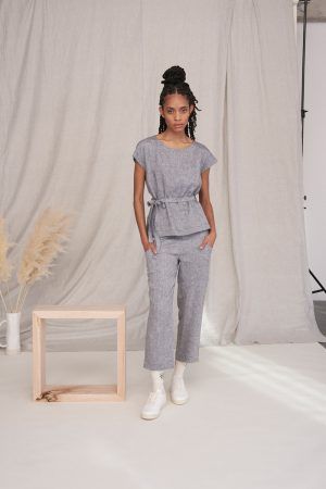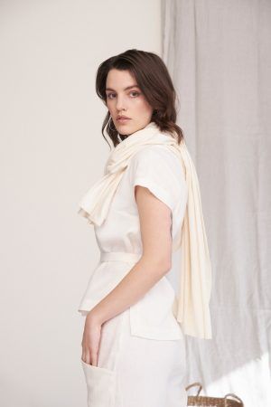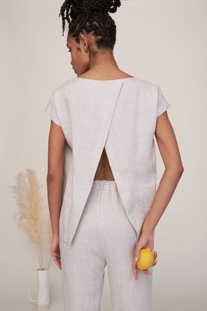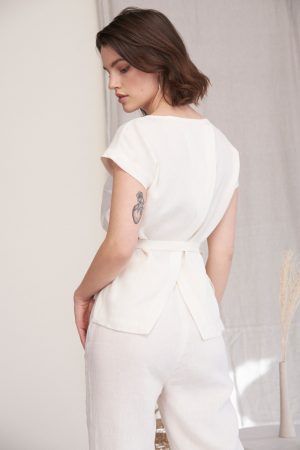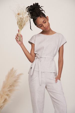 Wunderbar leichtes Top mit angeschnittenen Ärmeln und abnehmbarem Band. Elva hat eine Naht in der vorderen Mitte und ist im Rückteil schräg überkreuzt und etwas offen. Frisch I Frech und doch immer angezogen, der breite Saum ist vorne abgerundet und hinten eckig und länger.