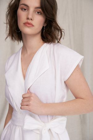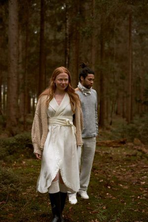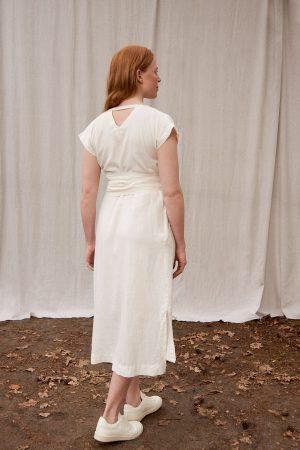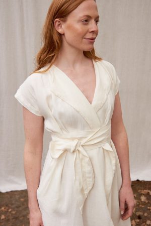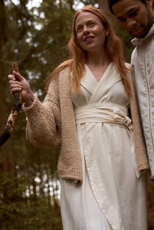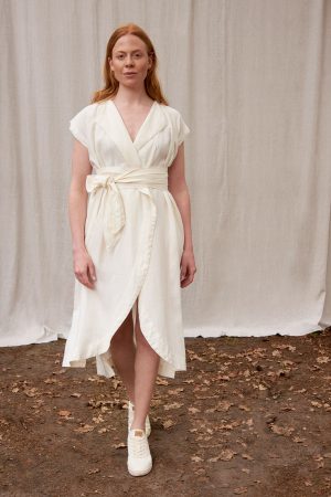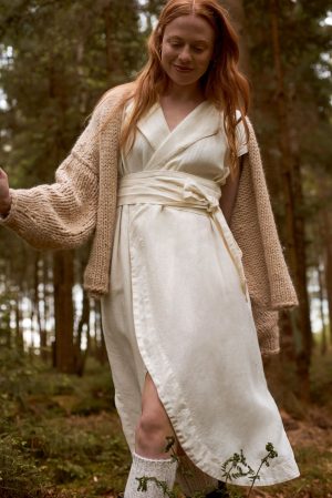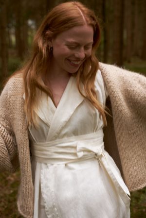 Wickelkleid mit Revers. Die vorne abgerundeten Seiten verleihen dem Rockteil sehr viel Leichtigkeit. Seitliche Schlitze, breiter Saum und ausgeschnittenes Dreieck im Nacken. Das Kleid entstand aus dem Brautkleid von Renas Schwester und war das erste Kollektionsstück. Ob festlich, sportlich, in der Schwangerschaft, unser Kleid Freya ist einfach immer eine treue Begleiterin.